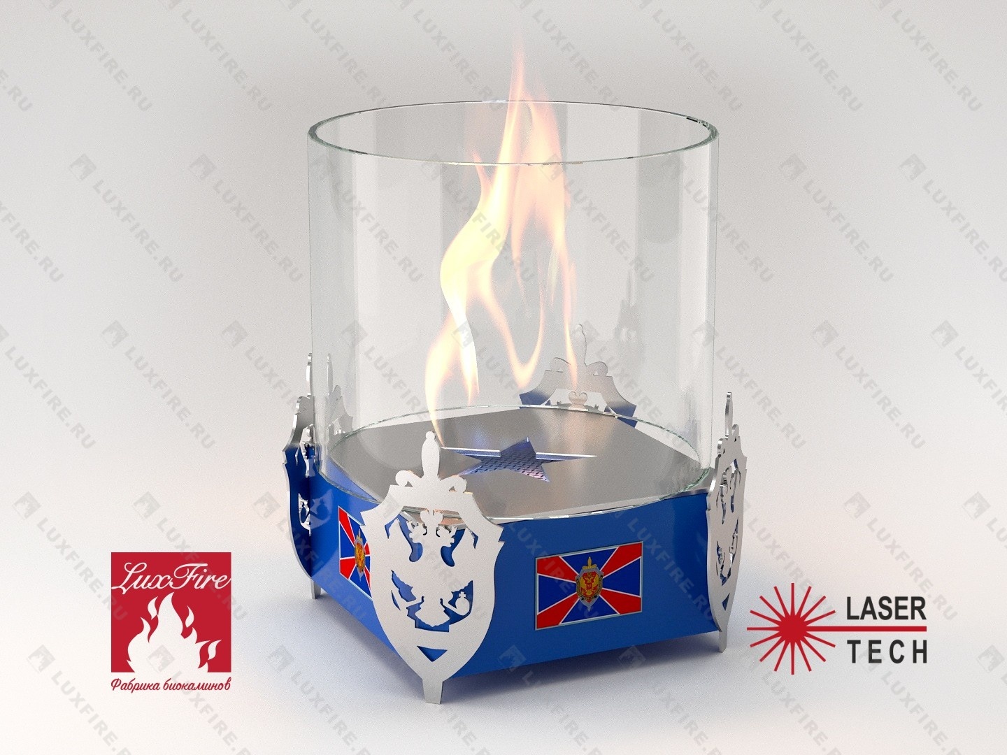 Представляет собой металлический внешний корпус с встроенным топливным блоком Lux Fire 150-2 на декоративных ножках в виде Щита. Огонь ограничивается стеклянным закаленным плафоном диаметром 180 мм.