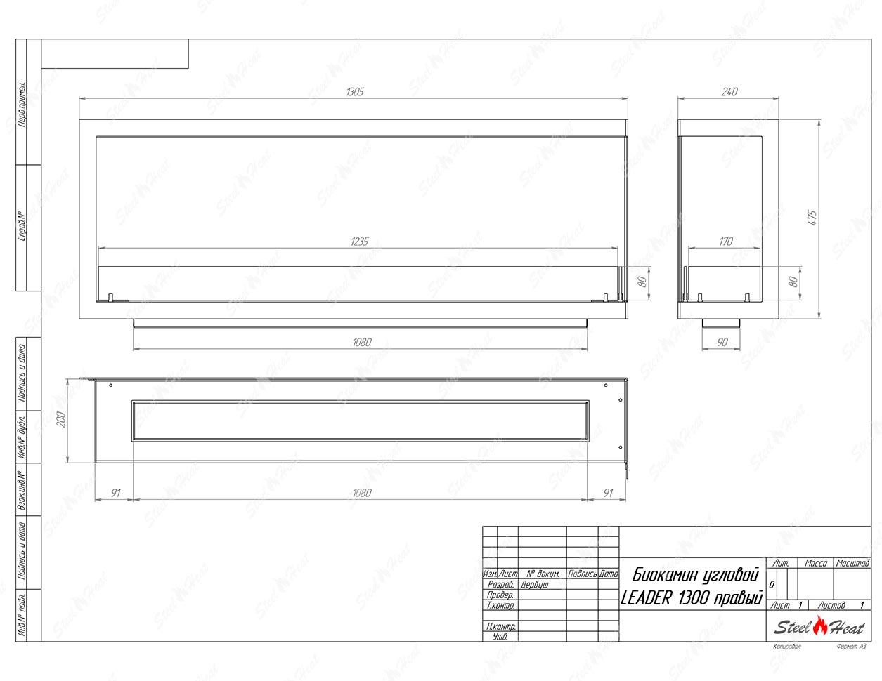 Встраиваемый Биокамин угловой SteelHeat Leader 1300 правыйпредназначен для встраивания в глухие ниши из гипсокартона, кирпича, пеноблоков, бетона.
